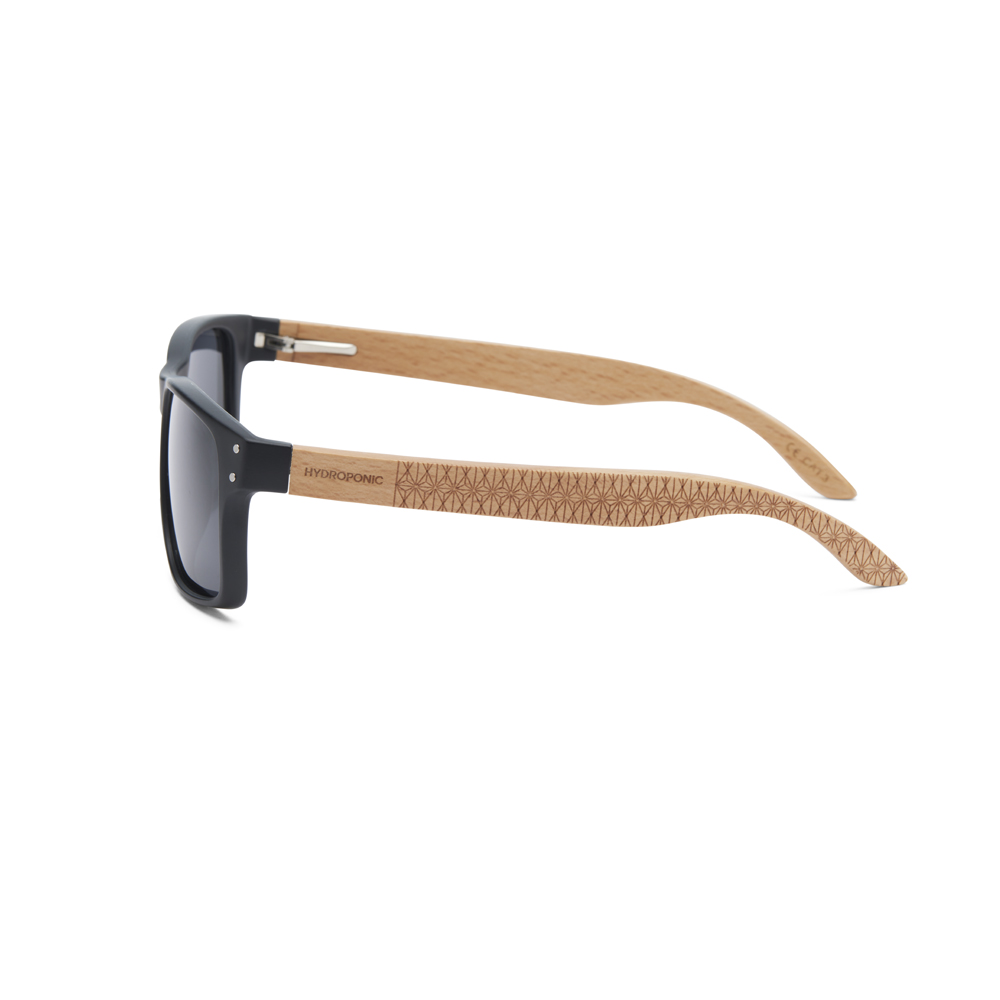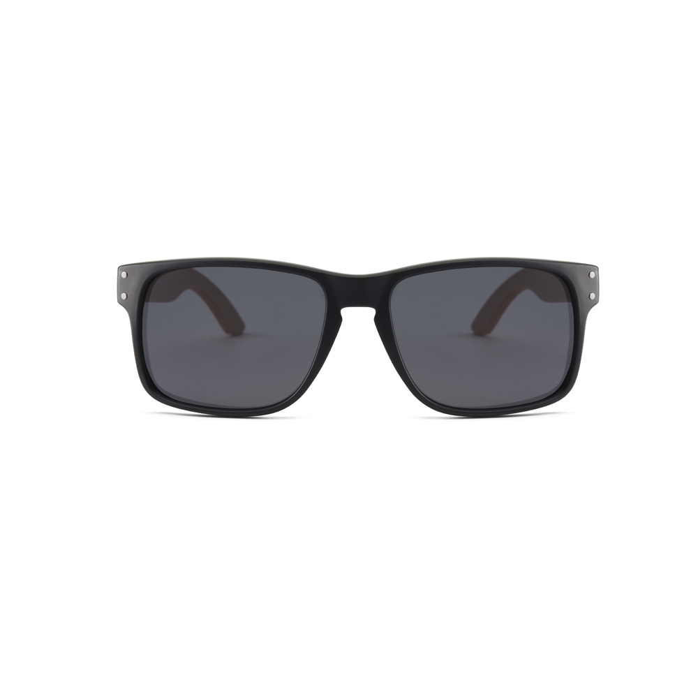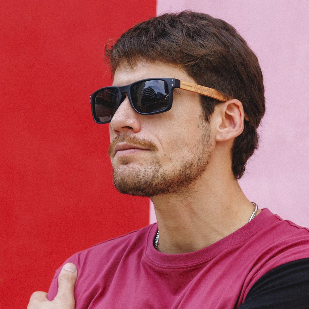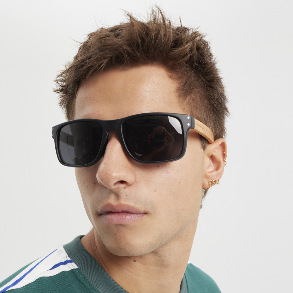• Dualidad de Materiales: Frontal de policarbonato negro mate de alta resistencia combinado con patillas de madera clara, creando un contraste visual equilibrado y ligero.