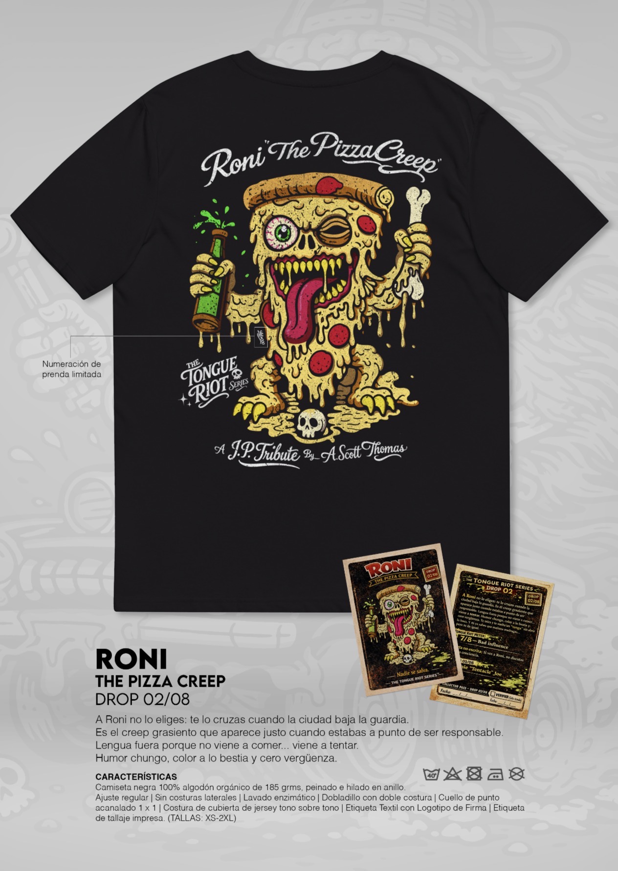 ¿Amante de la pizza y del estilo bizarro? La camiseta 'Roni The Pizza Creep' llega para servirte una dosis de arte underground que no dejará a nadie indiferente. Un diseño que mezcla el hambre voraz con la estética monstruosa más radical.